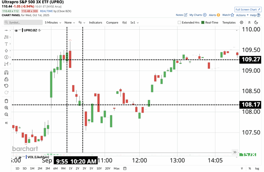 Buy UPRO below $109.26, with a Target of $109.81 and a Stop Loss of $108.17
