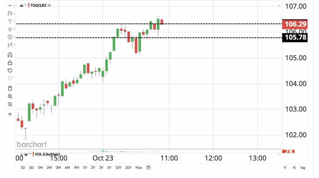 Buy TQQQ below $105.79 , with a Target of $106.32 and a Stop Loss of $104.73